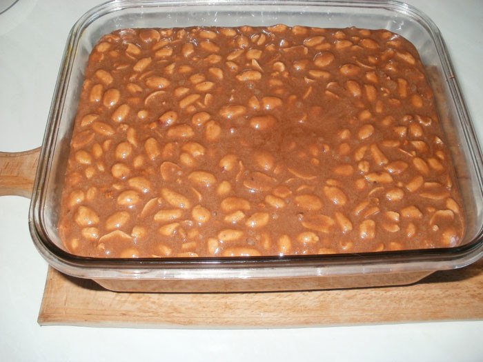 Дно формы застилаем бумагой для выпекания и засыпаем орехи. Заливаем будущий щербет и переносим в прохладное место для застывания. Застывший щербет нарезаем на кусочки и угощаем.