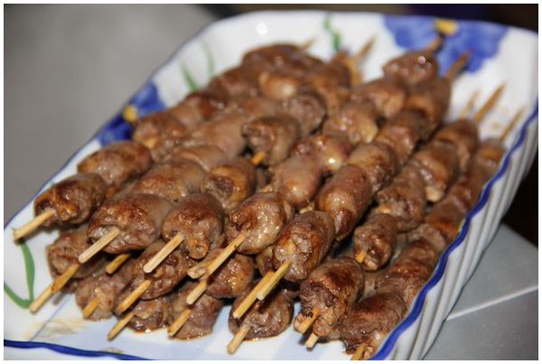 Для маринада: смешиваем соевый соус, мед уксус и и измельченный на мясорубке лук. Добавляем соль, перец и раздавленную в ступке щепотку зиры. Сердечки помещаем в маринад и маринуем около часа. Шпажки опускаем в воду на полчаса.