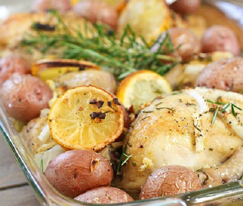 - В небольшой миске, взбить вместе лимонный сок, оливковое масло, чеснок, розмарин, измельченный красный перец, соль и перец. Вылейте смесь по всей курице и картофелю. Дополнительно посыпать щедро солью и перцем.