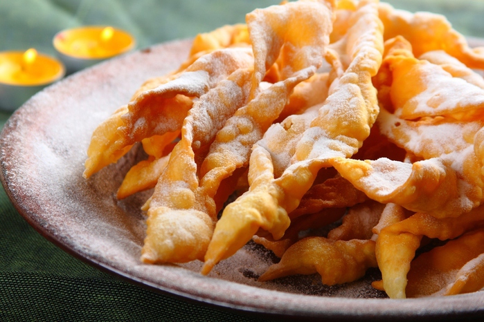 В кипящее масло опускаем бантики и со всех сторон равномерно их обжариваем до золотистого цвета. Затем вынимаем шумовкой, кладем сначала на салфетку, чтобы удалить излишки масла, потом перекладываем на блюдо и посыпаем сахарной пудрой.