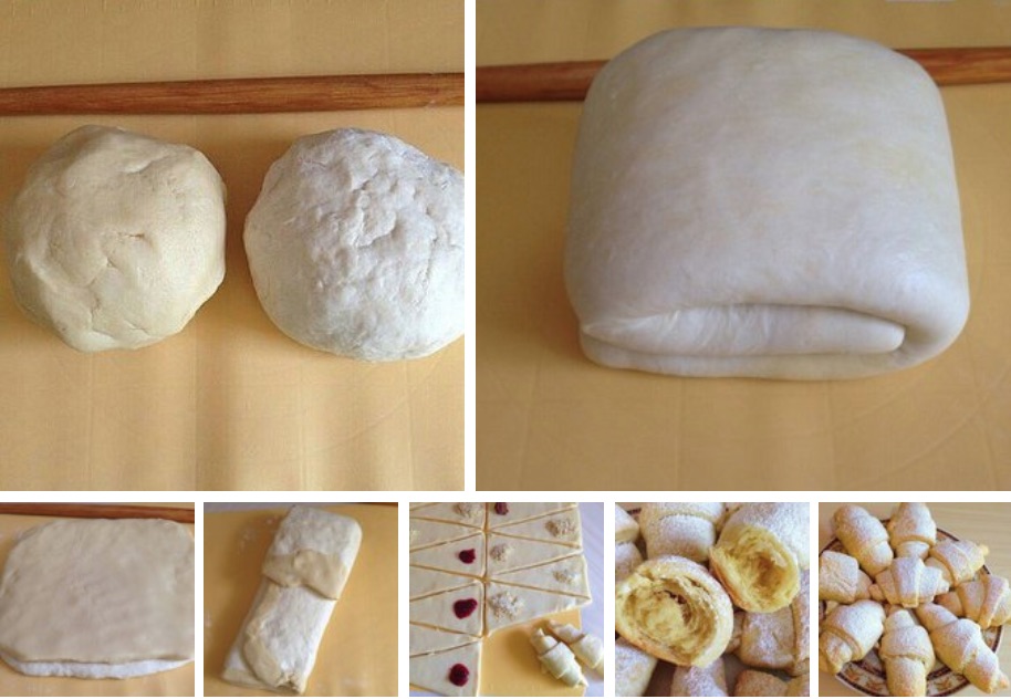 8. Я готовила двойную норму теста, поэтому после холодильника тесто слегка раскатала и разрезала на 2 пласта, пока из одного пласта делала рогалики, второй дожидался в холодильнике.