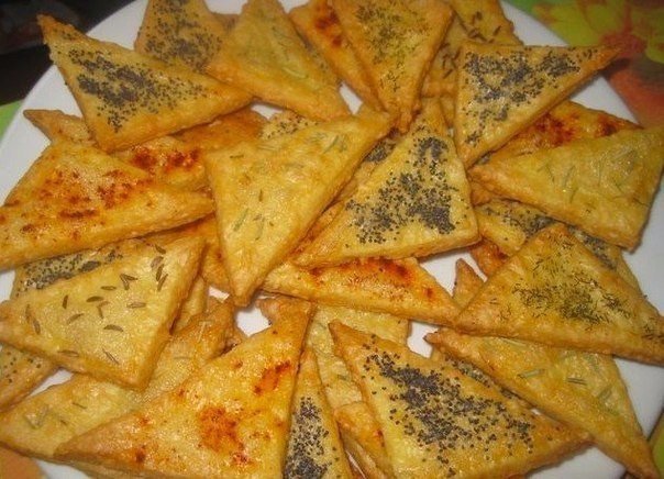 Смазать все треугольничка взбитым белком и посыпать тем, что под рукой есть. Повторить операцию со второй половиной теста.
