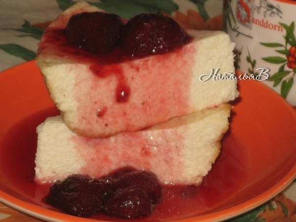 Затем достаем запеканку и охлаждаем прямо в форме, затем перекладываем на блюдо, нарезаем на порционные кусочки и поливаем вареньем.