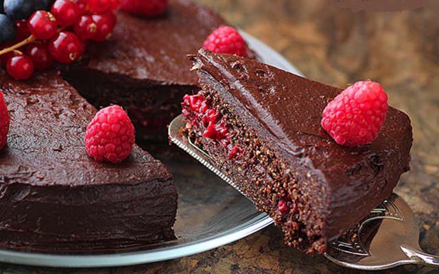Снимите бортики с формы и по всей поверхности распределите глазурь. Готовый торт украсьте ягодами и уберите в холодильник еще на пол часа. Когда торт застынет его можно подавать к столу