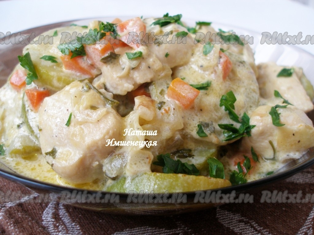 Выкладываем в сметанный соус куриное филе с кабачками, солим и перчим по вкусу, перемешиваем и тушим на медленном огне в течение 20-25 минут до готовности куриного филе.