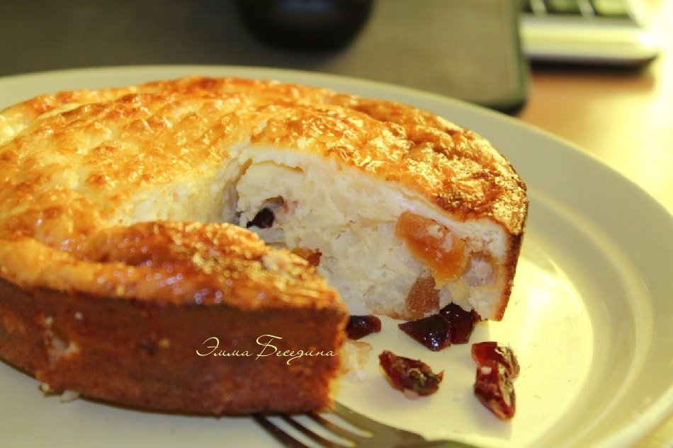 Смешиваем отварной рис с 2 яйцами, 50 г сметаны, сахаром, солью и ванильным сахаром, добавляем промытые сухофрукты и хорошо вымешиваем.