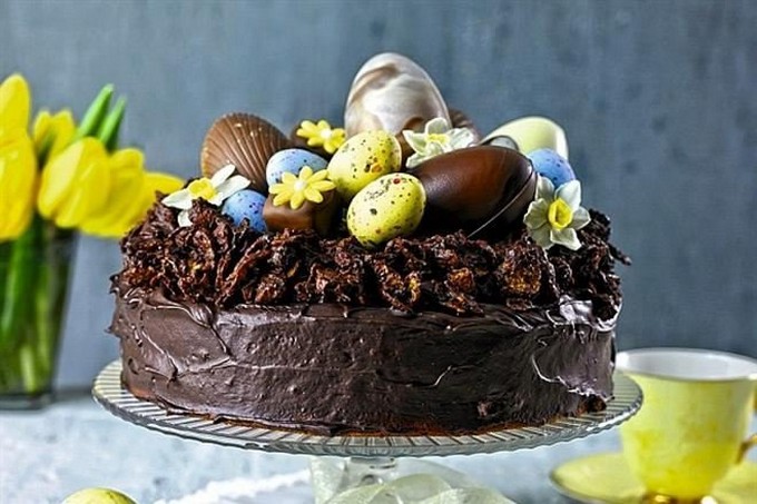 Кусочки молочного шоколада и сливки отправить в кастрюльку, поставить на слабый огонь и нагревать, пока шоколад не расплавится, размешивая венчиком, чтобы получилась блестящая однородная масса. Слегка остудить и покрыть глазурью торт. Когда шоколад застынет, украсить торт маленькими шоколадными яйцами и кондитерской посыпкой.
