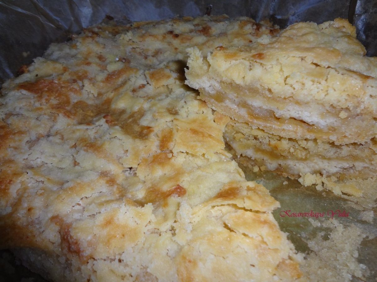 Высыпаем на дно формы ½ стакана сыпучего теста (чтобы дно формы было полностью закрыто), затем натертые яблоки, снова насыпаем сыпучее тесто, снова яблоки и т.д. Сверху должно быть тесто.