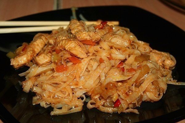 Отвариваем рисовую лапшу и отправляем её в вок к мясу и овощам, добавляем соус терияки, солим и перчим по вкусу, по желанию добавляем перец чили, постоянно помешивая, готовим ещё 3-4 минуты.
