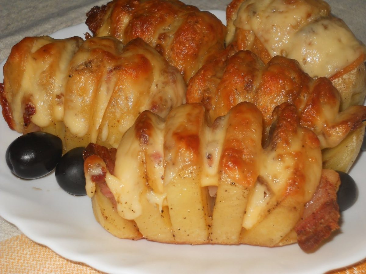 Вставляем в каждый разрез по ломтику бекона, можно чередовать бекон с сыром или с шампиньонами.
