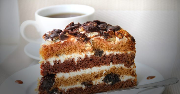 Выкладываем на блюдо первый из четырёх коржей, смазываем щедро кремом и посыпаем кусочками чернослива. Накрываем вторым коржом (другого цвета), повторяем те же действия.