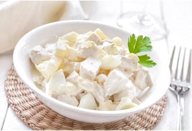 Соединяем готовые грибы, куриное филе и кусочки ананасов.
