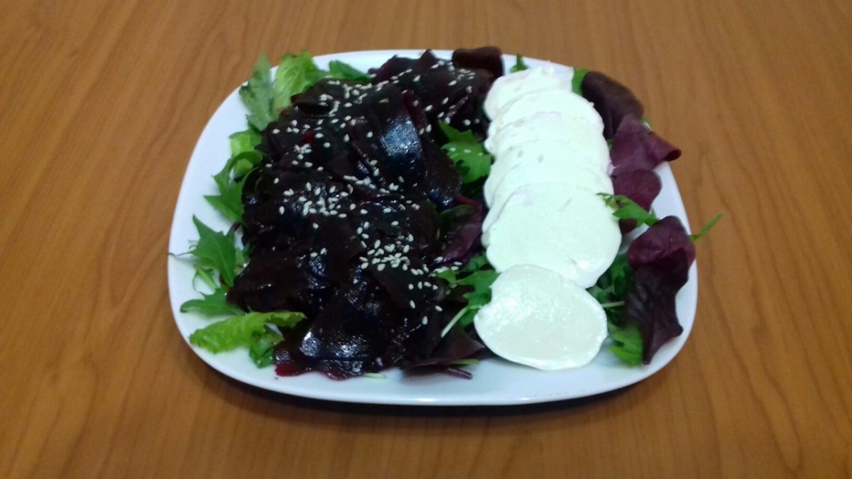 Выкладываем на блюдо салат микс, затем свеклу и моцареллу, посыпаем кунжутом.