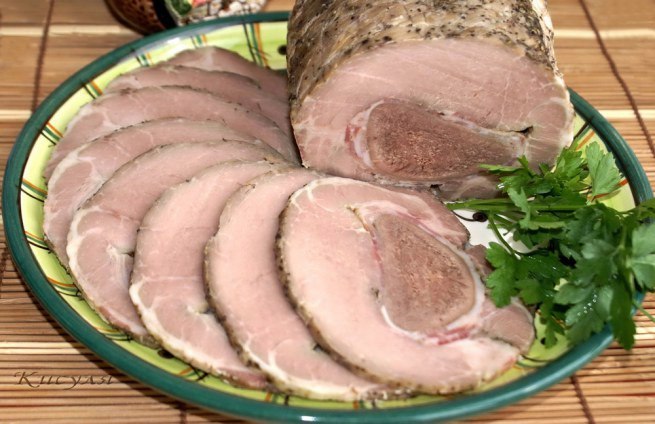 Сверху выкладываем маринованный язык, сворачиваем плотным рулетом и обвязываем шпагатом.