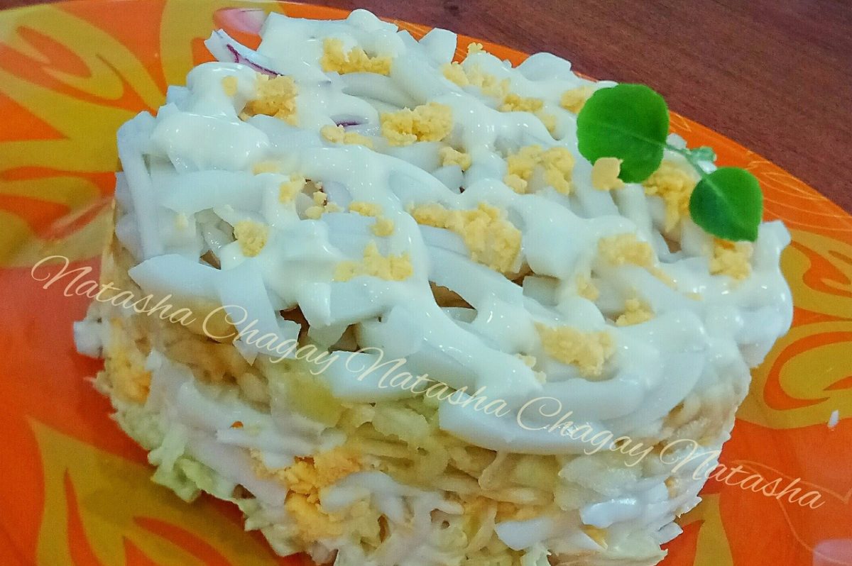 Выкладываем салат слоями снизу вверх: капуста порезанная соломкой, тертые на крупной терке яйца, тертые яблоки и кальмары порезанные соломкой.