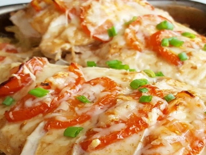 Промазала мясо маринадом, вставляем в надрезы кружочки помидоров.