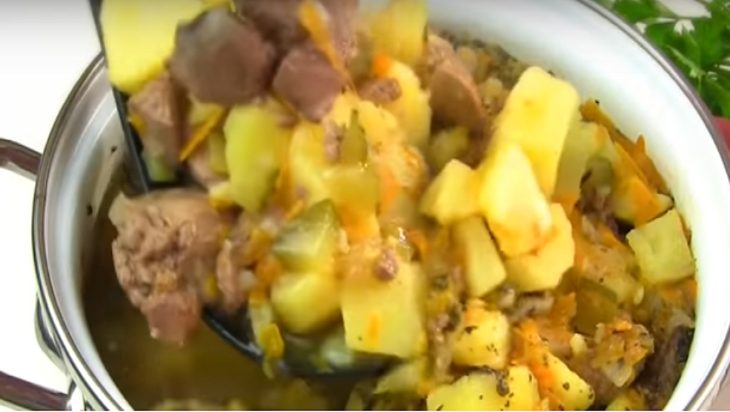 - В кастрюлю кладем картофель, добавляем печень с овощами и огурцы. Все заливаем водой так, чтобы продукты были ей полностью покрыты.