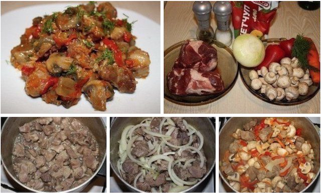Затем добавляем перец, нарезанный соломкой, половинки шампиньонов, тертую на крупной терке морковь и томатную пасту, обжариваем около 5 минут.